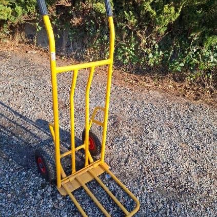 Säckkärra tvåhjulig i gul metall med luftgummihjul och handtag med grepp. Lämplig för transport av lådor, säckar och annat gods på hårda underlag som stenläggning och asfalt.