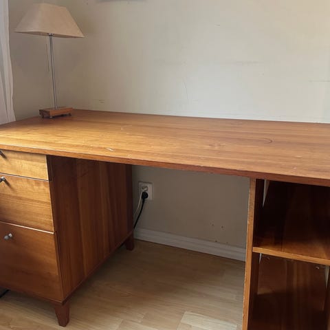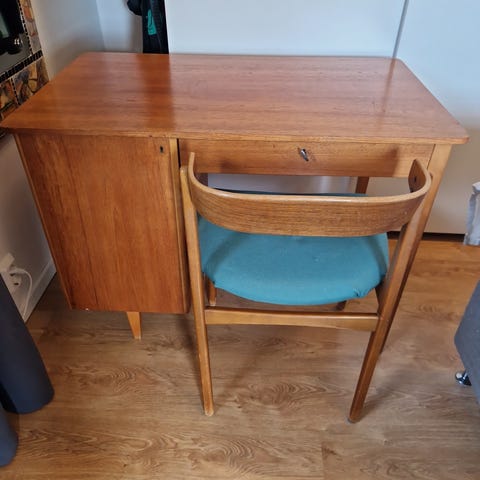 Fint skrivbord i Teak. 1950-70 tal. L 150cm, H 75cm, D 60 cm. Finns och hämtas i Valbo.