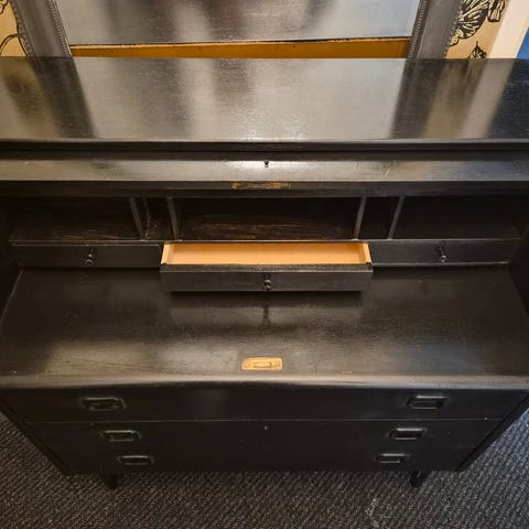 Söt liten sekretär troligen från 40-tal i björkfaner. Originalnyckel finns men saknar ”huvud”, går dock att använda.