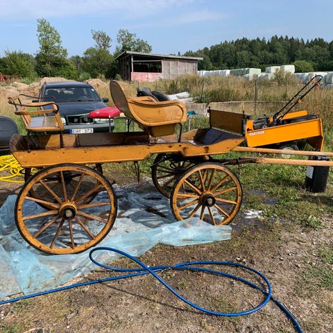 Hästvagn i röd färg med träkonstruktion och metallchassi. Vagnen har fyra ekrade hjul och sits med ryggstöd. Lämplig som hästdragen vagn, dekoration eller rekvisita. Färgen är sliten på flera ställen och vagnen har synliga bruksspår.