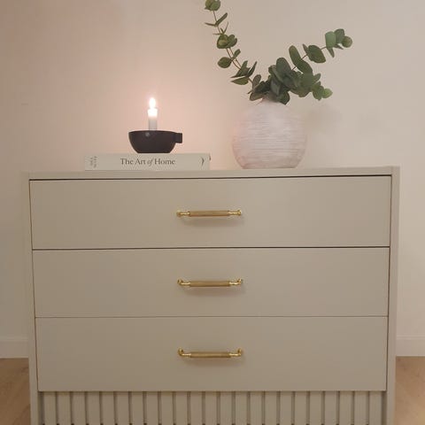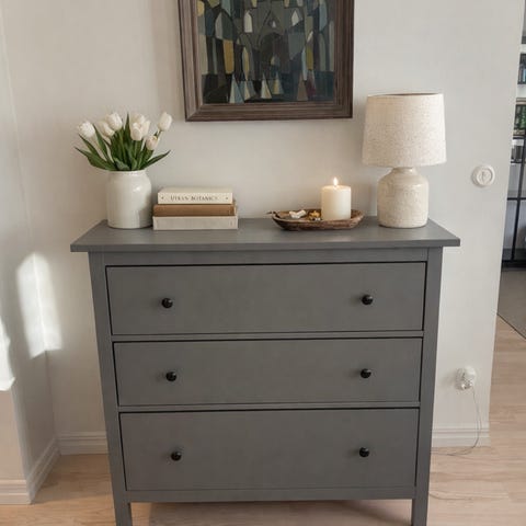 Antik byrå i furu som renoverats och målats i Nordsjös kulör Mio Energi (varm, mjuk ton).