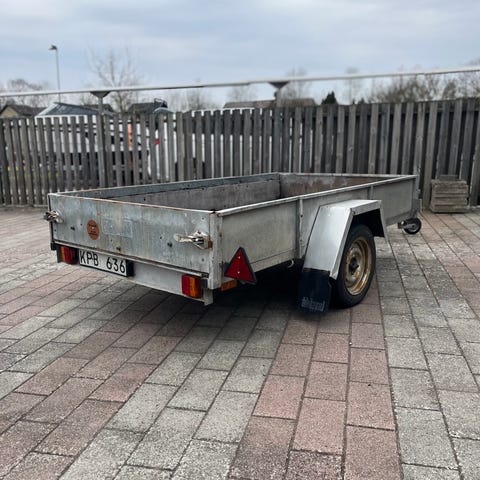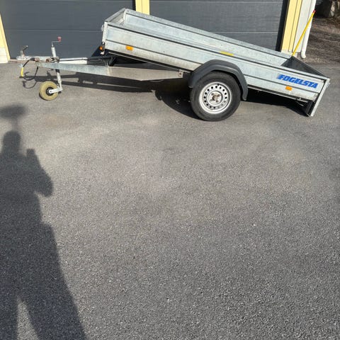 Fogelsta släpvagn för personbil. Öppen flakvagn med en axel och stålchassi. Bakljus och övrig belysning ok, men bromsljus orsakar nåt fel, troligtvis är någon sladd felkopplad/ärgad. Kopplad som på bild, och jag har lämnat öppet för att köpare ska se själv.