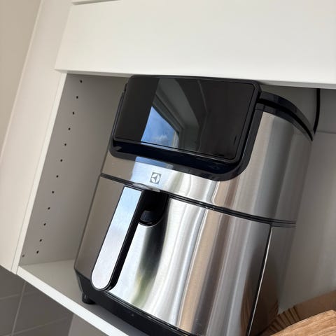 OBH Nordica Easy Fry Deluxe airfryer i rostfritt stål. Modellen har uttagbar korg och insats med non stick-beläggning samt löstagbar grillplatta. Airfryern är avsedd för tillagning av mat med varmluft, till exempel pommes frites, grönsaker, kött och bakverk. Medföljande bruksanvisning ingår enligt bild.