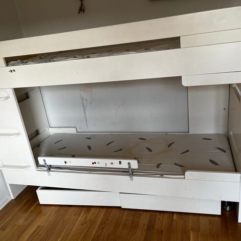 Sängen är i gott skick och endast använd av 2 småbarn. Man får gärna köpa med sig madrasser som köpts in på Ikea. I den övre sängen finns Åbygda skummadrass (inköpt för 2000 kr). i den nedre delen så finns Vesteröy pocketresårmadrass (inköpt för 2100 kr). Finns även en skyddande bäddmadrass över resårmadrassen.