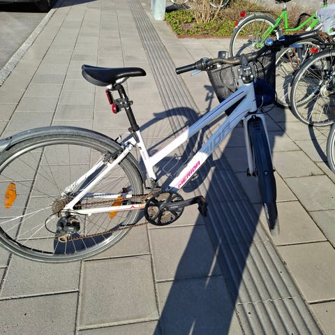 Handbromsen (fram och bak) och växlarna är Shimano. Ramen är av stål och absorberar vibrationer väl, samt håller en livstid. Ramstorleken är 61 cm.