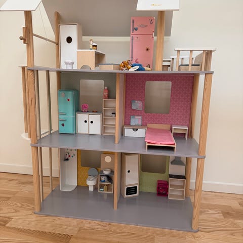 Säljer ett jättefint och detaljerat dockhus i trä med tre våningar, fullt möblerat och redo för lek.