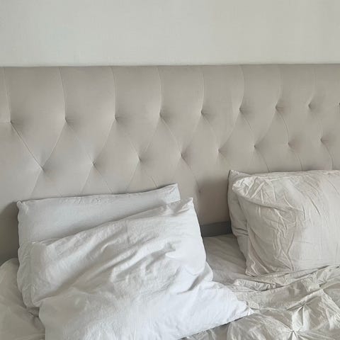 Mio sänggavel i beige textilklädsel. Sänggaveln har vadderad, rutquiltad framsida som ger ett mjukt intryck och stöd bakom kuddarna. Passar att placera mot vägg bakom säng i sovrum. Färgtonen är ljus och neutral, vilket gör den lätt att kombinera med olika sängkläder och inredningsstilar.