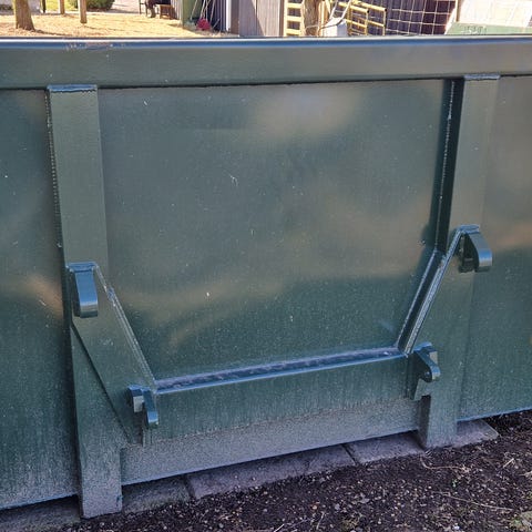 Metallcontainer i blå färg. Robust konstruktion i metall med höga sidor och baklucka. Lämplig för förvaring eller transport av material, exempelvis bygg- eller trädgårdsavfall, på arbetsplats eller gård.