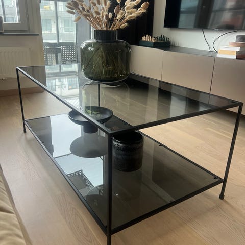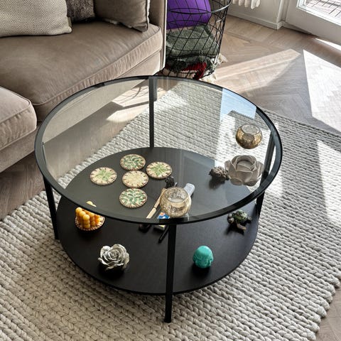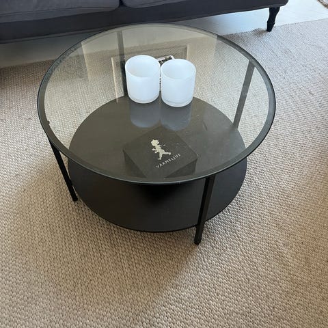 Köpt från Stalands. Fint skick, lite repor här och där på glasskivan. Praktisk hylla i metall under bordet. Hjul på benen vilket gör det lätt att flytta bordet. 100 cm diameter och 45 cm höjd.