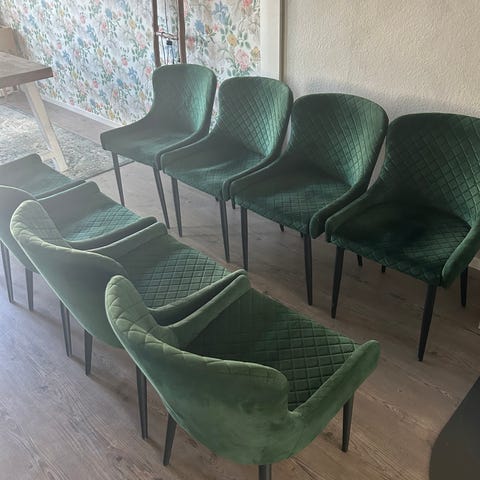 6 st Gröna sametsstolar. Rengjorda med möbeltvätt och är i fint skick!