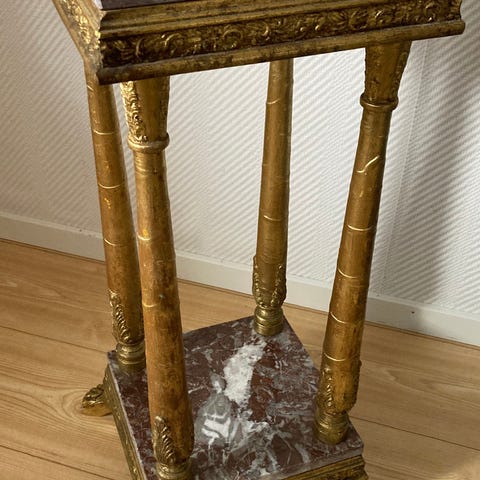 Gammal piedestal med två gröna marmorskivor, guldfärgade ben och guldfärgade lejontassar. Höjd 77 cm, översta skivan 26x26 cm. Säljes av dödsbo. För tung för att skickas.