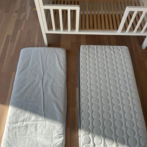IKEA Sundvik spjälsäng i vit färg. Till sängen ingår en madrass ”KRUMMELUR” från IKEA. I väldigt fint skick, några få ställen med färgskav.