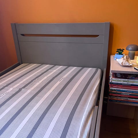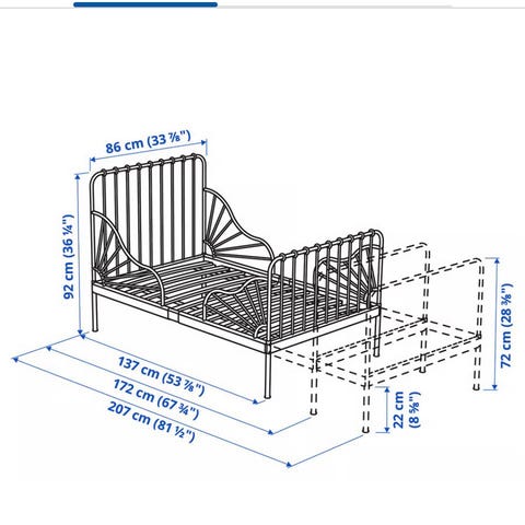 IKEA MINNEN utdragbar säng för barn. Sängen är tillverkad i metall och är vit. Modellen är utdragbar och kan justeras i längd enligt behov. Design med höga gavlar och sidor som ger en inramad sovplats. Passar som växasäng för barn som behöver en säng som kan förlängas över tid.