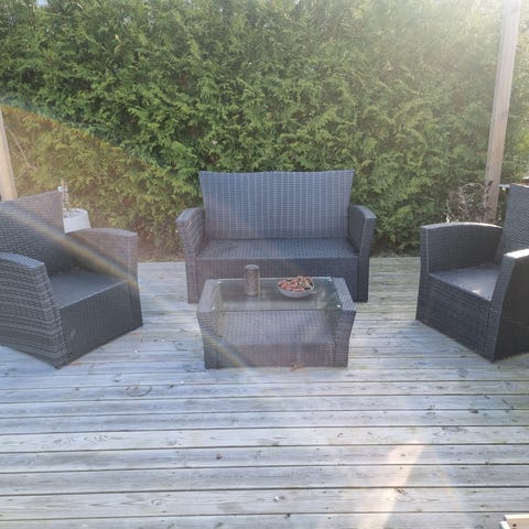 Säljer en fin och bekväm loungegrupp i svart konstrotting. Perfekt till altan eller uteplats.