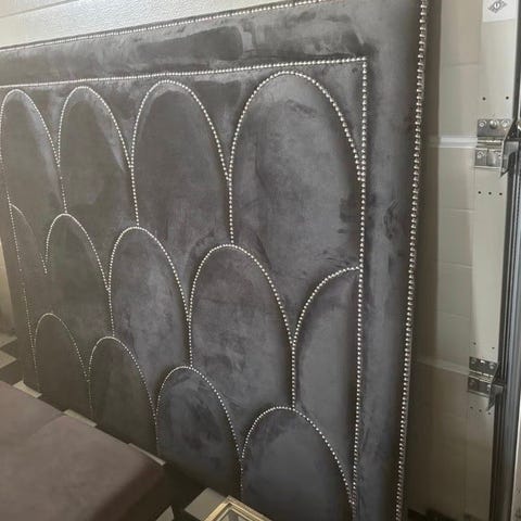 Chilli sänggavel i svart sammet. Gaveln har dekorativa nitar i mönster på framsidan. Passar som huvudgavel till säng och placeras mot väggen bakom madrassen. Materialet är mjukt tyg med stoppning bakom för bekväm lutning vid sittande i sängen.