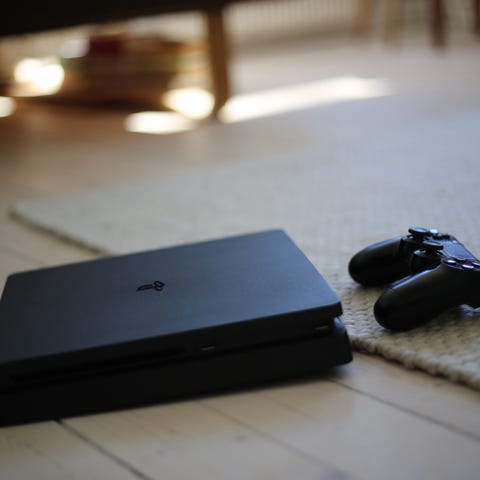 Sony PlayStation 4 Slim spelkonsol i vit färg. Konsolen visas tillsammans med två trådlösa DualShock 4-handkontroller, en svart och en guld/vit. Passar för spel, film och streaming via kompatibla tjänster. Ansluts till TV eller skärm via HDMI och stödjer trådlös anslutning för handkontroller och nätverk via wifi eller nätverkskabel.