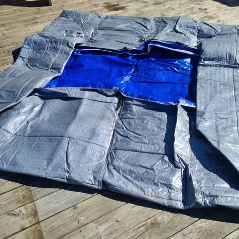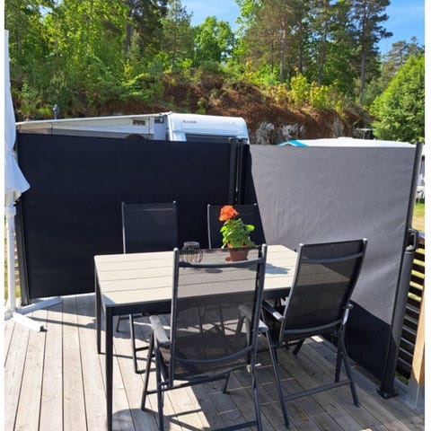 Vindskydd randigt blått och vitt med fönstersektioner