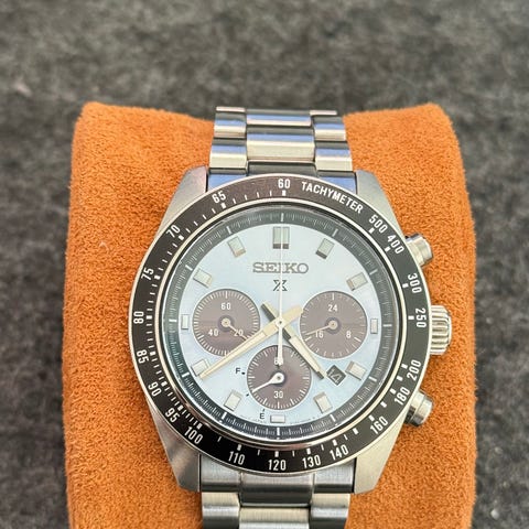 Seiko Prospex Solar Speedtimer SCC911P1. Den sitter i dagsläget på ett gummiband men levereras med original länkarmband. Klockan kommer komplett med alla tillbehör.