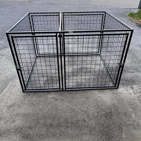 Dubbel hundbur i svart metallgaller. Buren har två separata fack med varsin dörr framtill. Avsedd för transport eller förvaring av hundar i exempelvis bil eller hemma. Konstruktionen är i metall med galler runtom för god ventilation och insyn. Vissa spår av rost förekommer på gallret enligt bilderna. Finns i Vuollerim