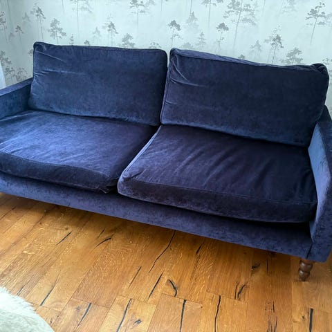 Blå sammetssoffa bortskänkes emot upphämtning då vi köpt en ny soffa.
