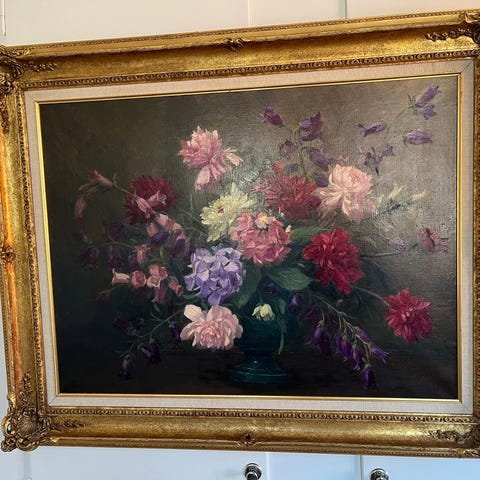 Inramad tavla med motiv av ett stilleben föreställande frukt i glasskål och blommor i glasvas placerade i ett fönster. Verket är inramat med vitt ramverk och glas, enligt märkning Artglass AR 70. Motivet har realistisk stil med tydliga ljus- och skuggeffekter. Passar som väggdekoration i exempelvis vardagsrum, kök eller hall.