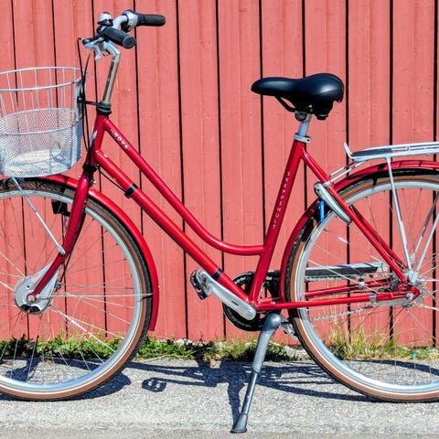 Klassisk ram med lågt insteg, utrustad med framkorg, pakethållare bak, stänkskärmar, ramlås och kedjeskydd. Cykeln har fotbroms bak och handbroms fram och tre växlar.