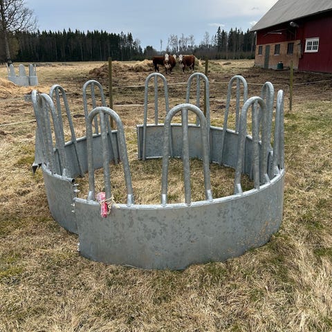 Venostal foderhäck i galvaniserat stål. Konstruktion med nätsektion framtill och täckt tak som skyddar fodret mot nederbörd. Anpassad för utfodring av exempelvis hö eller ensilage till betesdjur. Robust metallram och plåtsidor ger stabilitet och hållbarhet vid användning utomhus i hage eller på bete. 2 m lång ca 150 cm hög