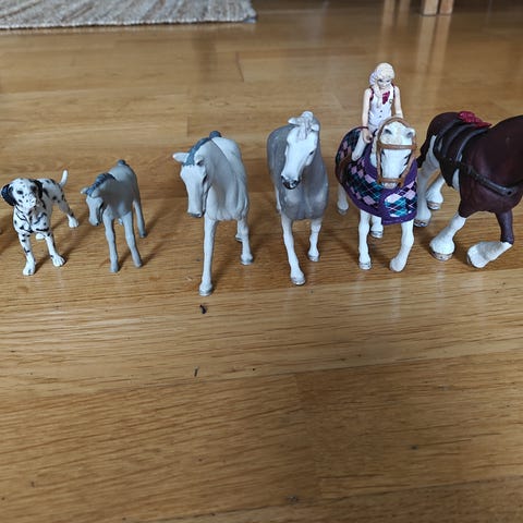 13 hästar varav en häst har en fast sittande sadel och träns/grimma