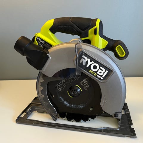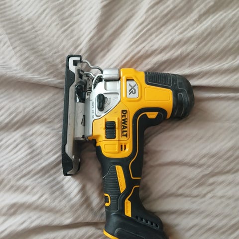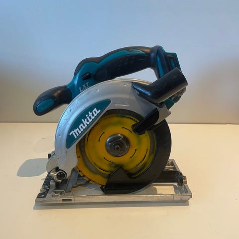 DeWalt cirkelsåg batteridriven i gul färg. Handhållen modell med ergonomiskt handtag och skyddskåpa i metall. Sågen är avsedd för kapning och klyvning av trä och liknande material.