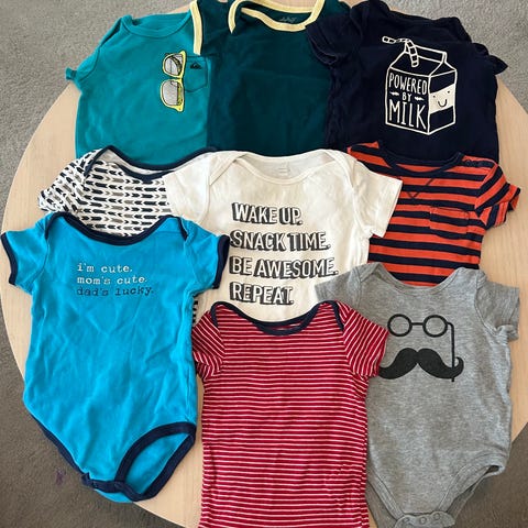 Klädpaket med 6 bodies i bra skick från olika märken såsom H&M, Carter’s och mer.