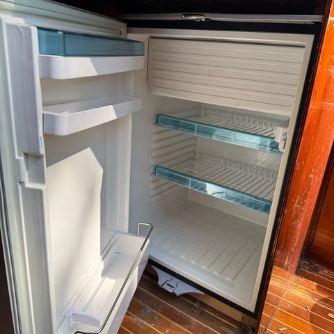 Waeco kylskåp i fristående modell. Skåpet har front i beige färg med ljusgrå ram. Invändigt finns frysfack upptill, hyllplan samt lådor för förvaring. Dörren har fack för mindre varor. Passar exempelvis i husbil, husvagn, båt eller som extra kyl i förråd eller gäststuga.är ett par år men aldrig använd!monterades ur ny båt pga byte till större