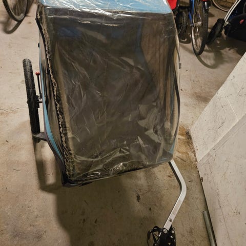 Cykelvagn i blått och grått med genomskinligt regnskydd framtill. Vagnen kopplas till cykel med dragstång och fäste bak på cykeln. Invändigt finns plats för last eller sittplats med mjuk dyna/fäll. Passar för transport av barn eller packning bakom cykel, med skydd mot väder och vind via knappar till plastfönster framtill. Rymmer två barn och mycket förvaring i luckan bakom. Märke: Hamax. Köptes in aug 2025 och har använts sparsamt. Kvitto finns. Tillgänglig 5/5 då jag får bil och behöver ej cykeln med vagnen.