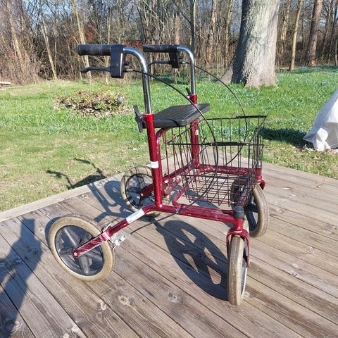 Röd rollator med korg och sits