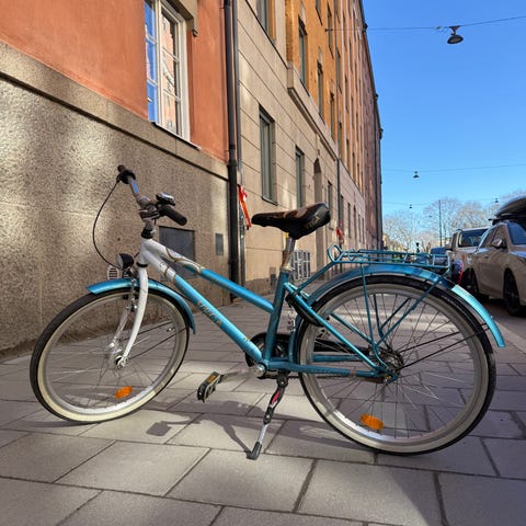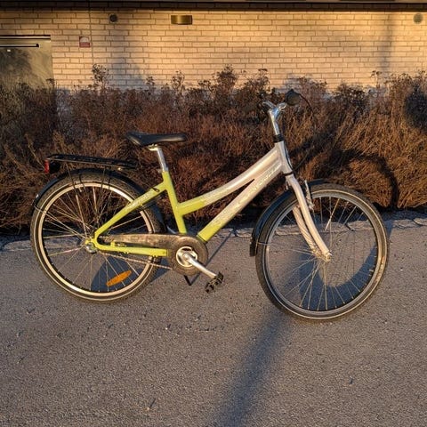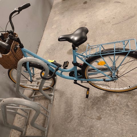 BTWIN barncykel med 24" hjul i turkos färg. Mycket bra skick, liten skada på sadeln. Avtagbart fram- och bakljus ingår. Cykeln har lågt insteg, handbroms, 6 växlar. Utrustad med korg framtill, kedjeskydd, stänkskärmar och stöd. Sadeln är svart och styret har handtag anpassade för barn. Passar för barn som behöver en cykel i 24-tumsstorlek för vardagscykling till skola och fritidsaktiviteter.