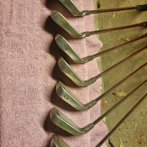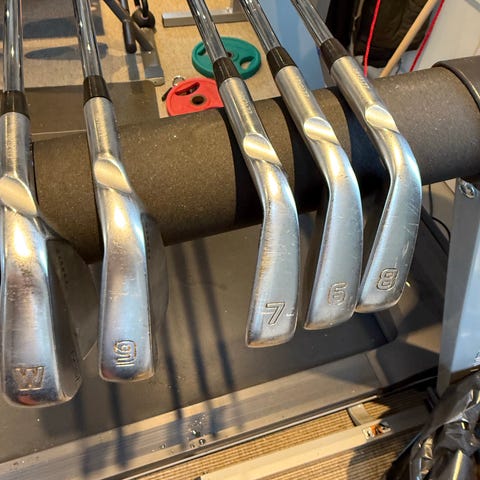 Ping S 59 järnklubbor set. Setet består av sex järnklubbor med numren 3,4,5,6,8,9. Klubborna har stålskaft och grepp med tvåfärgad struktur för bättre greppkänsla. Som synes av bilden saknas 7an, men går säkert köpa till begagnad hos en Pinghandlare. Skickar med en 7a av ett annat fabrikat.