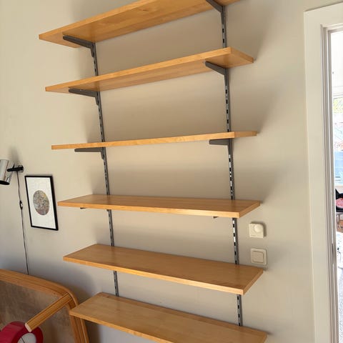 Komplett Elfa-hyllsystem säljes i mycket fint skick med hyllplan i trä. Exklusive skruv.