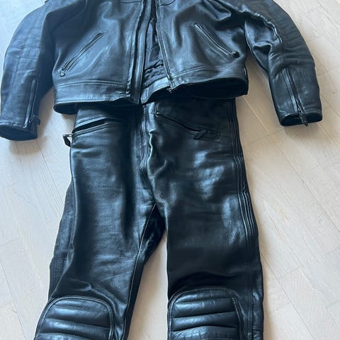 Scott mc-ställ med jacka och byxa i svart färg. Stället består av en längre jacka med frontknäppning och justerbara remmar i midjan samt byxor med hängslen och förstärkta partier. Reflexdetaljer finns på byxorna för bättre synlighet. Passar för motorcykelkörning och liknande användning där skyddande ytterkläder behövs. Materialet är ett kraftigare tyg anpassat för mc-bruk.