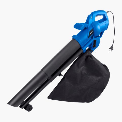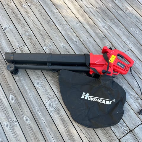 Black+Decker lövblås och lövsug med uppsamlare i orange och svart. Utrustad med blåsrör framtill och uppsamlingssäck baktill för insamling av löv och trädgårdsskräp. Passar för rengöring av uppfarter, altaner och andra utomhusytor där löv och mindre skräp behöver blåsas bort eller samlas upp.