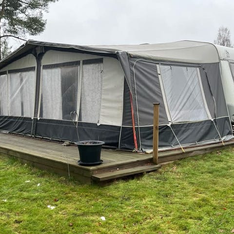 Inaca fjord förtält i grått och vitt med stora fönster och gardiner. A-mått 1025. Säljes endast pga, att tältet blev för stort då vi fick bygga ny altan och köpa nytt förtält med kortare A-mått, det finns fläckar, och det syns på nära håll att det är använt, men det är helt och ok.