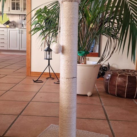 Katträd klösträd i beige färg med flera nivåer. Trädet har en bottenplattform med inbyggd koja och rund öppning, flera stolpar med klösyta samt hyllplan i olika höjder. Överst finns en liggplats och en hängande boll-leksak. Passar för inomhusbruk för kattens lek, klättring och vila.