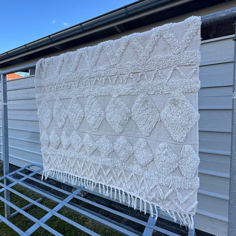 IKEA matta med mönster i flerfärgad design. Mattan har ljus mittdel och bård med geometriska och blommiga motiv i dova toner. Lämplig som golvmatta i exempelvis vardagsrum, hall eller sovrum. Franskant på kortsidorna ger ett traditionellt utseende. Material och exakta mått är inte angivna. Dem kvadrat mått mattorna är 2 ggr 1,40