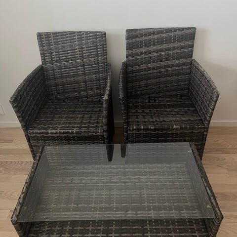 Soffa, två stolar och glasbord
