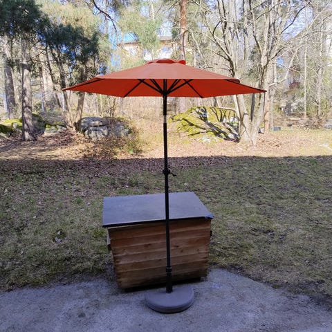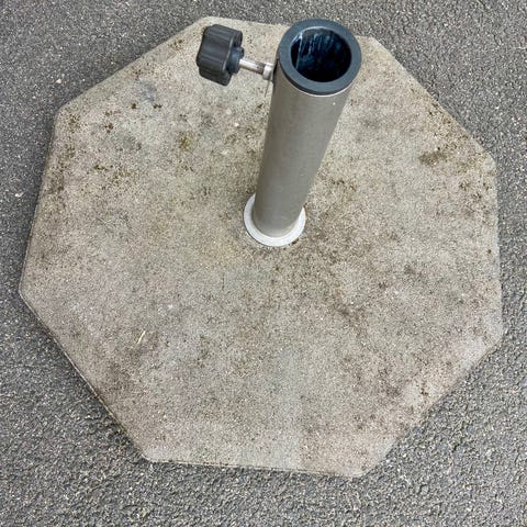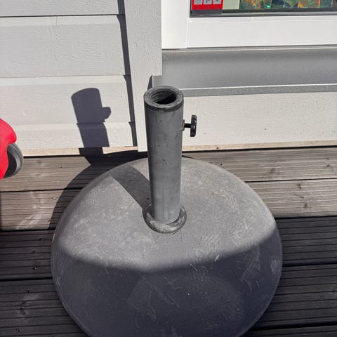 Parasollfot Hillerstorp 50 kg i betong med hjul för enklare förflyttning. Synligt använd men inga funktionella defekter. Hämtas i Nacka.