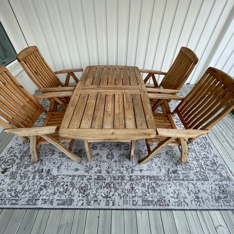 Oljat teakbord, Brafab, för 6 eller 8 personer med 4 stolar inklusive dynor.