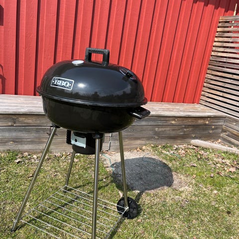 BBQ klotgrill i svart utförande med lock. Grillen står på fyra ben, varav två med hjul för enkel förflyttning. Grillgaller i metall och ventilationsöppningar i botten. Medföljer skyddande grillöverdrag. Passar för kol- eller brikettgrillning utomhus på exempelvis altan eller uteplats.