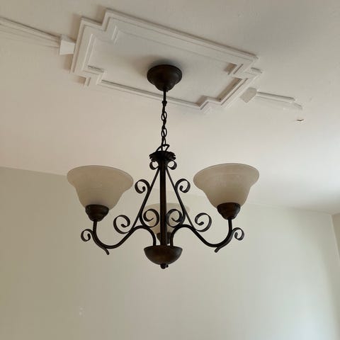 Jätte fin taklampa med fem ljuskällor i mässing och glas. Det ger varm ljus.