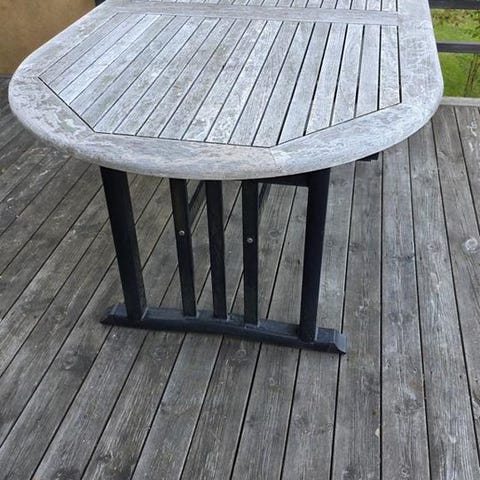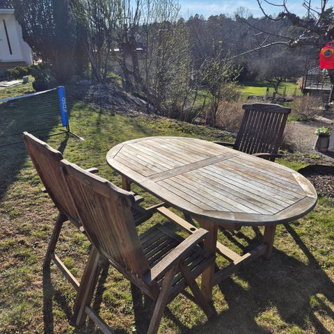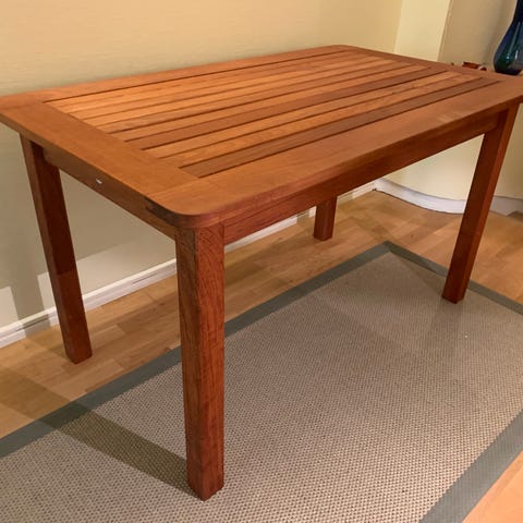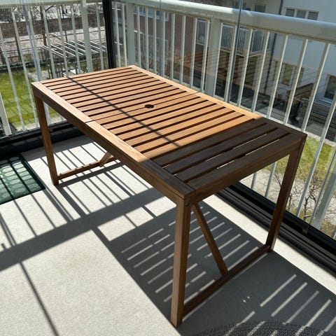 Rektangulärt utebord i teak med ribbad bordsskiva i teak.Bordet har fyra raka ben och ett runt hål i mitten av skivan som kan användas för parasoll. Passar som matbord eller avlastningsbord på uteplats, altan eller balkong.