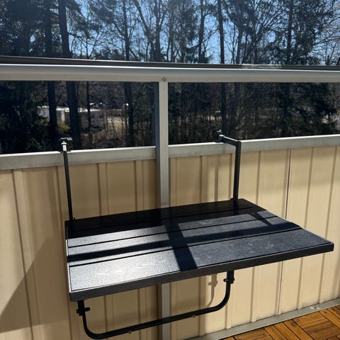 Metallhylla för balkong med fyra hyllplan i svart perforerad metall. Hyllan är avsedd att fästas mot vägg eller räcke och passar till exempel för förvaring av krukväxter eller andra mindre föremål utomhus. Stabil konstruktion i metall som lämpar sig för användning på balkong eller uteplats.