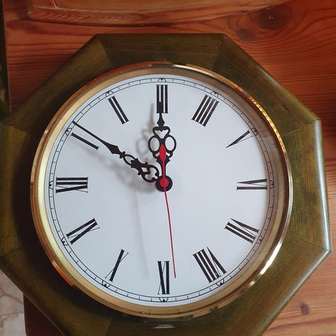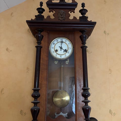 Väggpendyl klocka i brun träkonstruktion med glasad frontlucka. Klockan har vit urtavla med svarta siffror och dekorativa visare, omgiven av en metallring. Nederdelen har synlig pendel bakom glas. Överdelen är utsmyckad med svarvade trädetaljer och dekorativ relief. Det saknas översta delen på krönet samt två pelare ( bild 3).