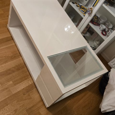 Elegant soffbord i glas med vit skiva att t.ex. lägga böcker/ tidningar.